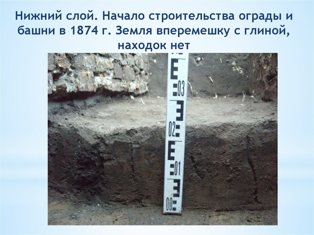 Нижний слой. Начало строительства ограды ибашни в 1874 г. Земля вперемешку с глиной,