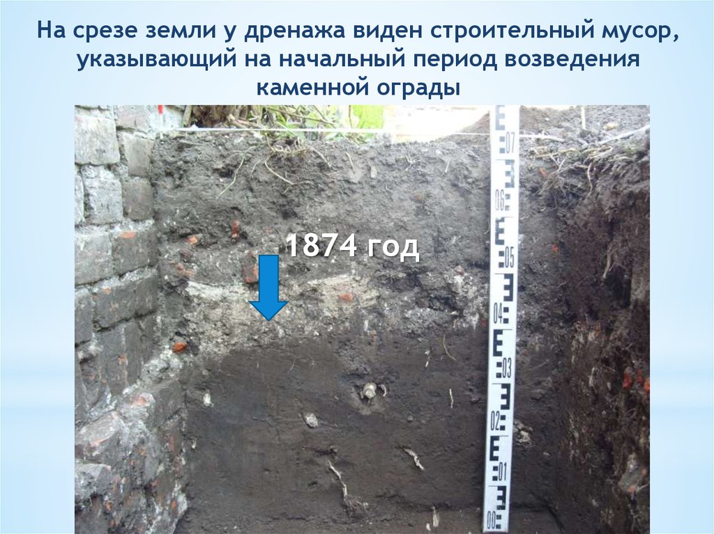 На срезе земли у дренажа виден строительный мусор,указывающий на начальный период возведения