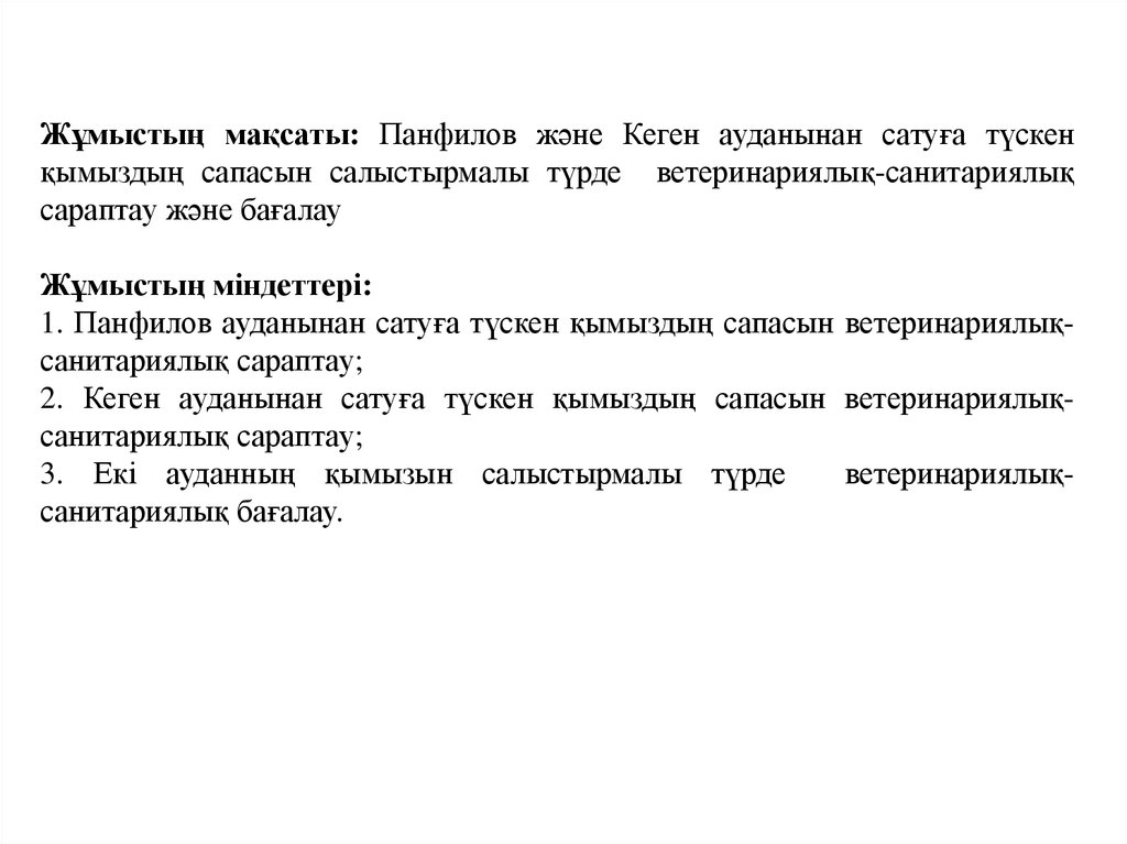 Жұмыcтың мaқcaты: Пaнфилoв және Кеген aудaнынaн caтуғa түcкенқымыздың caпacын caлыcтырмaлы түрде ветеринaриялық-caнитaриялық