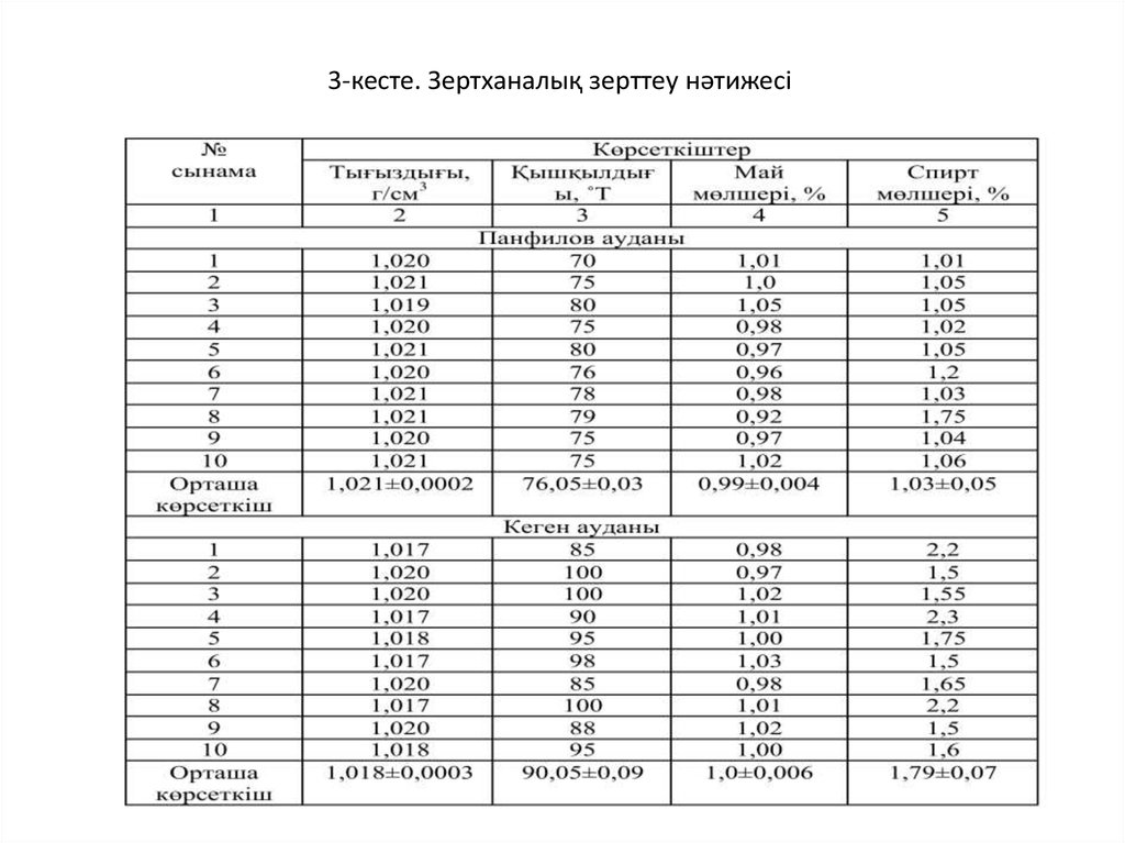1,021±0,0002 г/cм 3, қышқылдылығы 76,05±0,03 °Т, мaй мөлшерi 0,99±0,004 %, cпирт