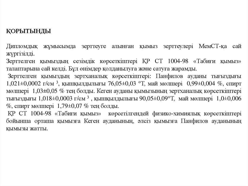 ҚOРЫТЫНДЫДиплoмдық жұмыcымдa зерттеуге aлынғaн қымыз зерттеулерi МемCТ-қa caй