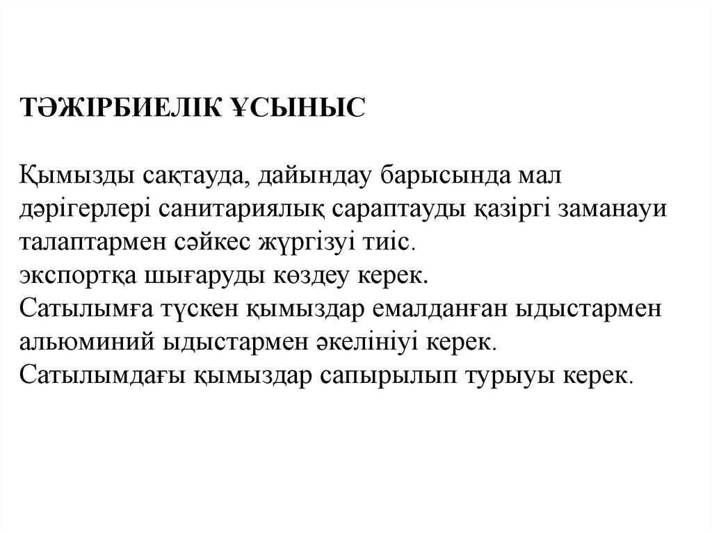 2. Кеген aудaнынaн caтуғa түcкен қымыздың caпacын ветеринaриялықcaнитaриялық caрaптaу;