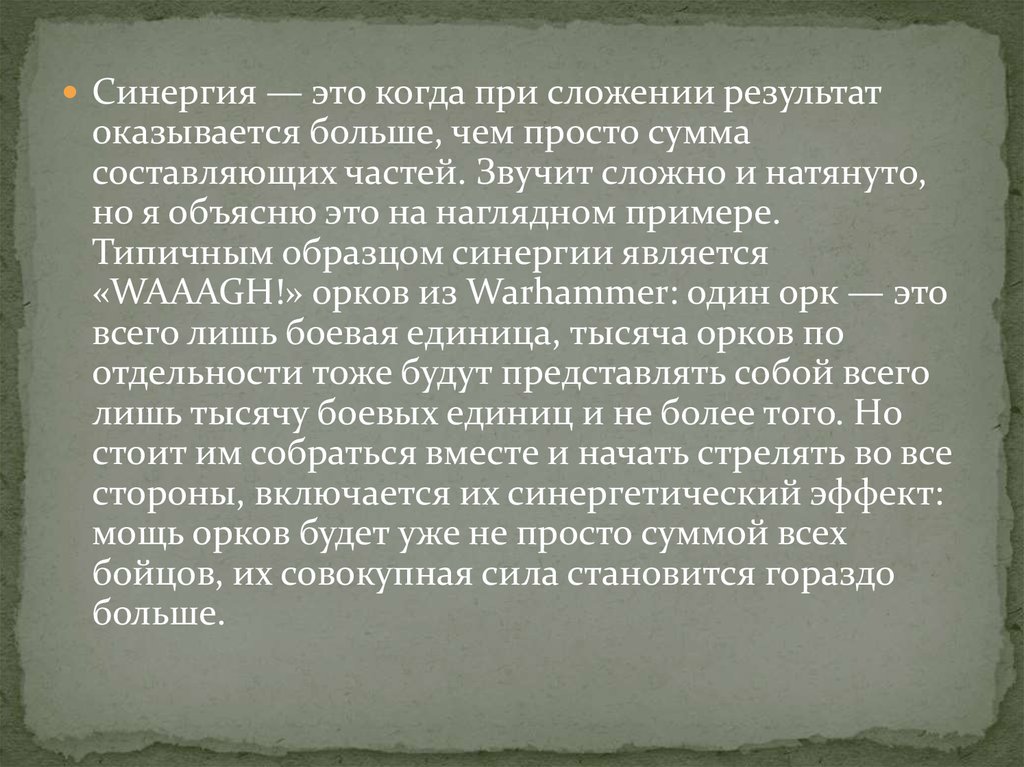 Синергия — это когда при сложении результатоказывается больше, чем просто сумма