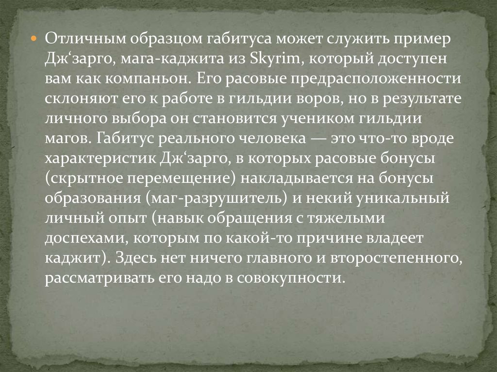 Отличным образцом габитуса может служить примерДж‘зарго, мага-каджита из Skyrim, который доступен