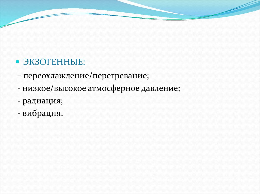 ЭКЗОГЕННЫЕ:- переохлаждение/перегревание;