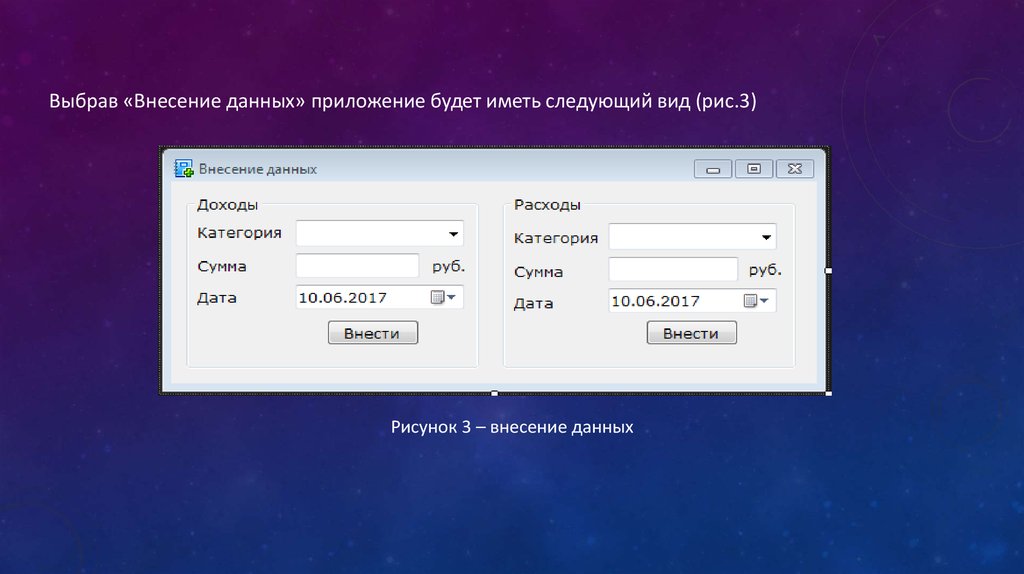 Выбрав «Внесение данных» приложение будет иметь следующий вид (рис.3)Рисунок 3 – внесение данных