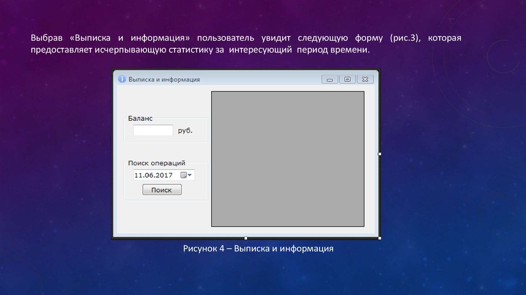 Выбрав «Выписка и информация» пользователь увидит следующую форму (рис.3), котораяпредоставляет исчерпывающую статистику за интересующий период времени.