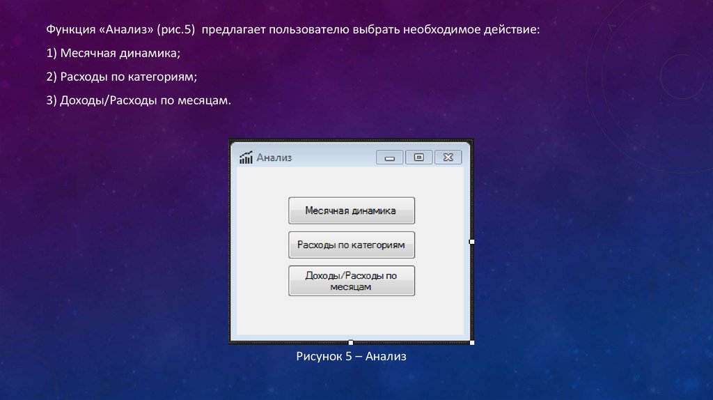 Функция «Анализ» (рис.5) предлагает пользователю выбрать необходимое действие:1) Месячная динамика;