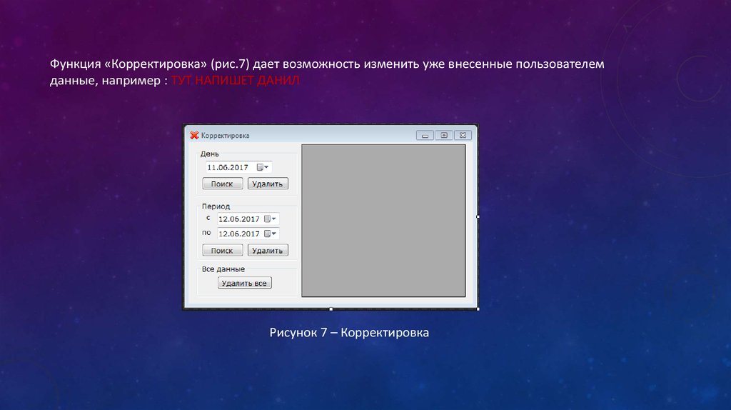 Функция «Корректировка» (рис.7) дает возможность изменить уже внесенные пользователемданные, например : ТУТ НАПИШЕТ ДАНИЛ