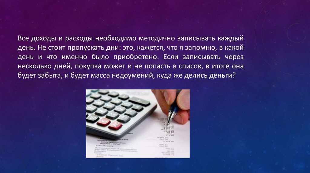 Все доходы и расходы необходимо методично записывать каждыйдень. Не стоит пропускать дни: это, кажется, что я запомню, в какой