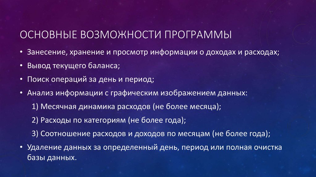 ОСНОВНЫЕ ВОЗМОЖНОСТИ ПРОГРАММЫ• Занесение, хранение и просмотр информации о доходах и расходах;