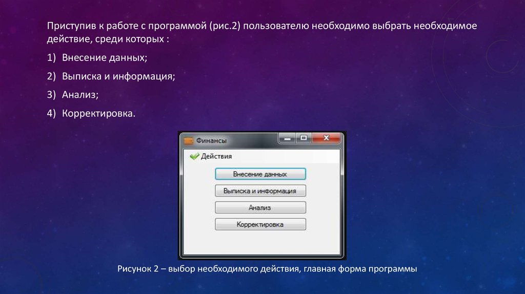 Приступив к работе с программой (рис.2) пользователю необходимо выбрать необходимоедействие, среди которых :