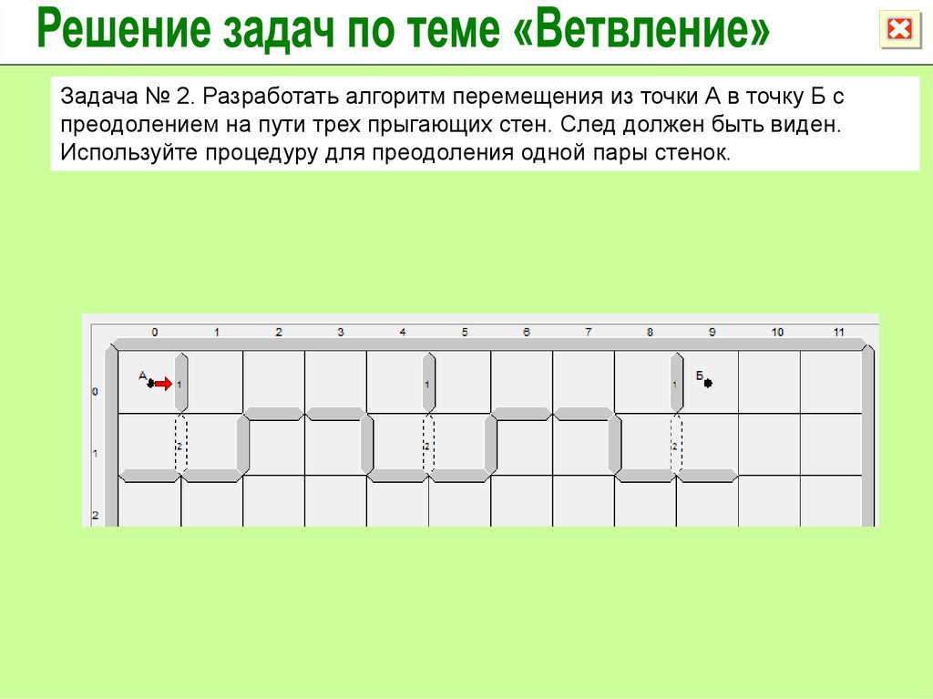 Задача № 2. Разработать алгоритм перемещения из точки А в точку Б спреодолением на пути трех прыгающих стен. След должен быть виден.