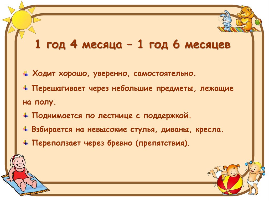 1 год 4 месяца – 1 год 6 месяцевХодит хорошо, уверенно, самостоятельно.
