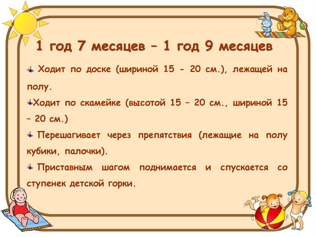 1 год 7 месяцев – 1 год 9 месяцевХодит по доске (шириной 15 - 20 см.), лежащей на