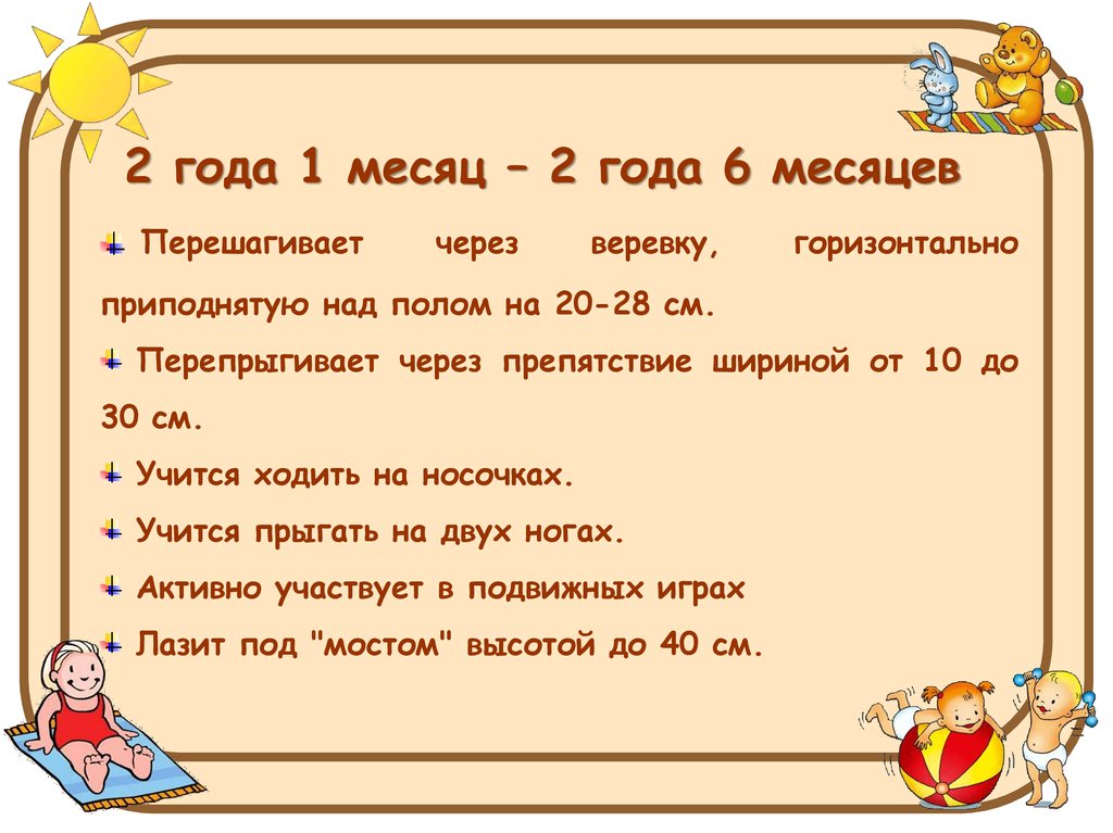 1 год 10 месяцев – 2 годаПерешагивает через препятствия (на 10 см.).