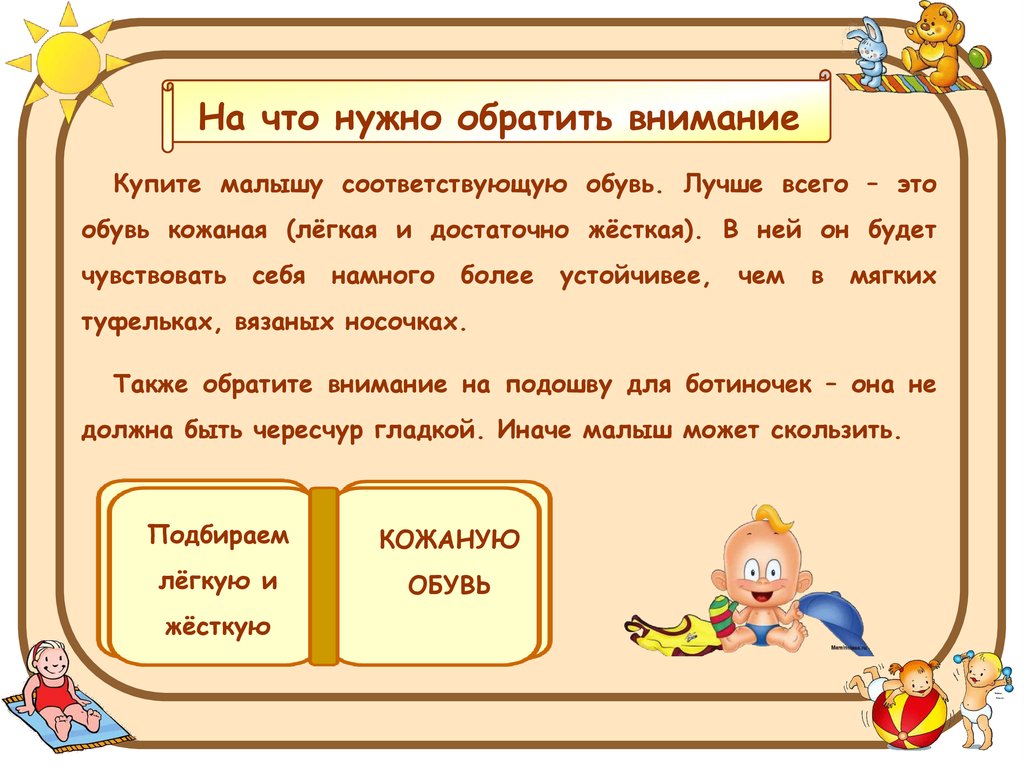 На что нужно обратить вниманиеКупите малышу соответствующую обувь. Лучше всего – это