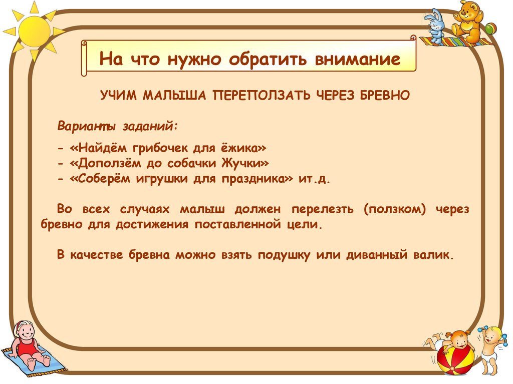На что нужно обратить вниманиеУЧИМ МАЛЫША ПЕРЕПОЛЗАТЬ ЧЕРЕЗ БРЕВНО