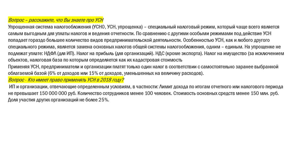 Вопрос – расскажите, что Вы знаете про УСНУпрощенная система налогообложения (УСНО, УСН, упрощенка) – специальный налоговый режим, который чаще всего является