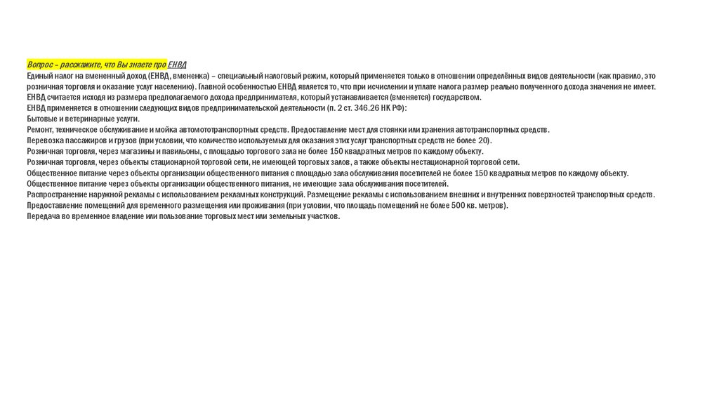 Вопрос – расскажите, что Вы знаете про ЕНВДЕдиный налог на вмененный доход (ЕНВД, вмененка) – специальный налоговый режим, который применяется только в отношении определённых видов деятельности (как правило, это