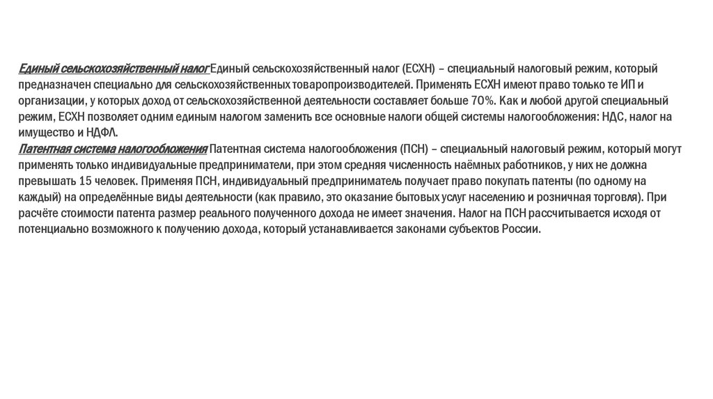 Единый сельскохозяйственный налог Единый сельскохозяйственный налог (ЕСХН) – специальный налоговый режим, которыйпредназначен специально для сельскохозяйственных товаропроизводителей. Применять ЕСХН имеют право только те ИП и