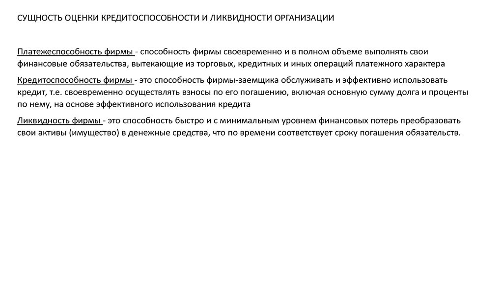 СУЩНОСТЬ ОЦЕНКИ КРЕДИТОСПОСОБНОСТИ И ЛИКВИДНОСТИ ОРГАНИЗАЦИИПлатежеспособность фирмы - способность фирмы своевременно и в полном объеме выполнять свои