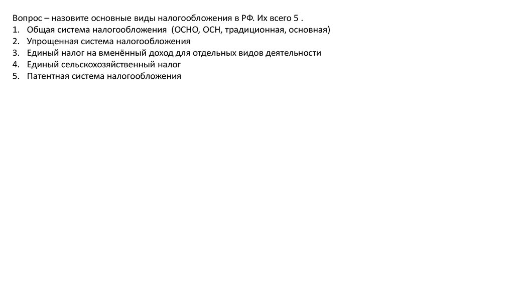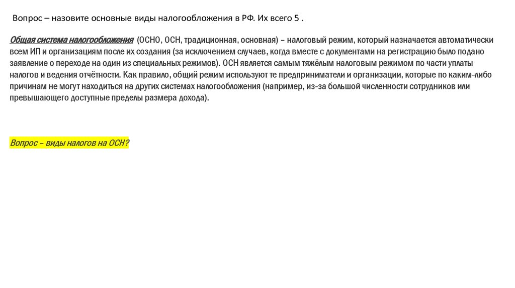 Вопрос – назовите основные виды налогообложения в РФ. Их всего 5 .1. Общая система налогообложения (ОСНО, ОСН, традиционная, основная)