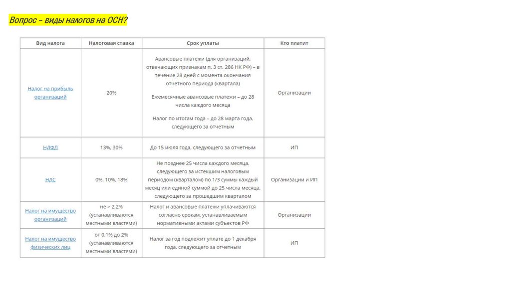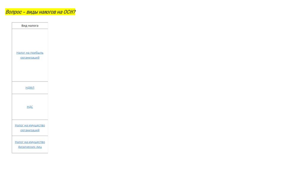 Вопрос – виды налогов на ОСН?7.