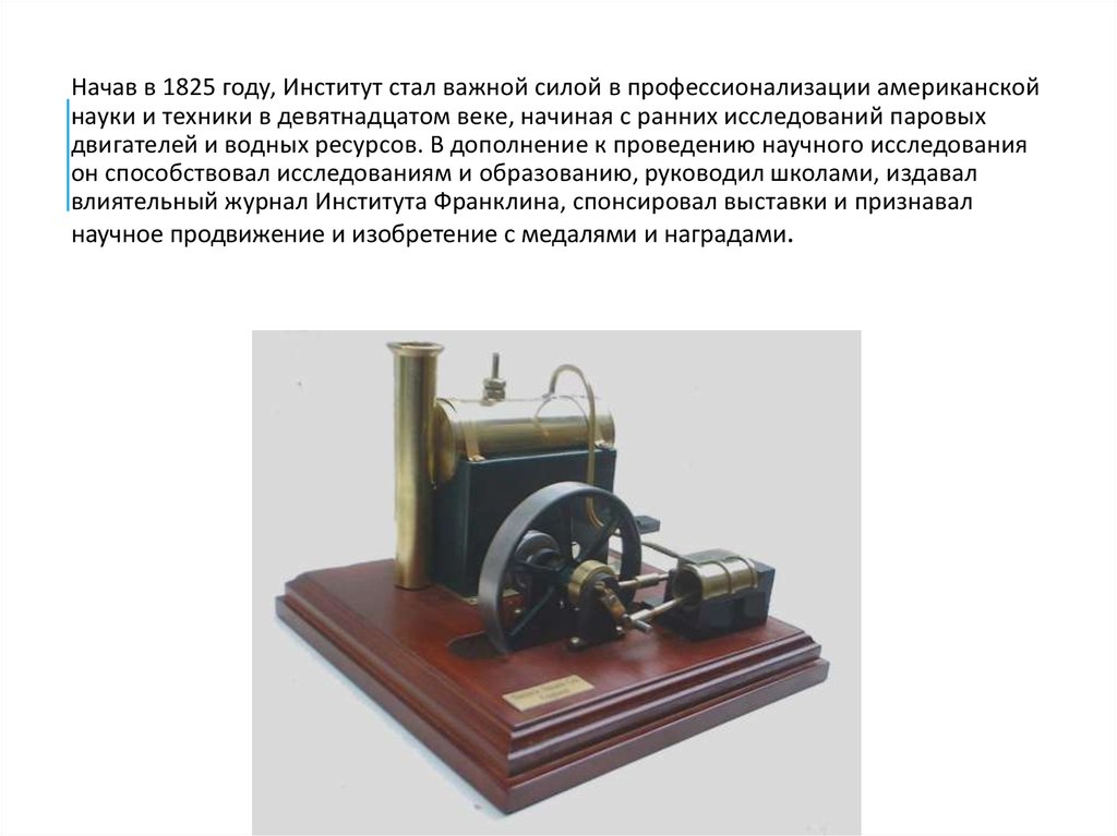 Начав в 1825 году, Институт стал важной силой в профессионализации американскойнауки и техники в девятнадцатом веке, начиная с ранних исследований паровых