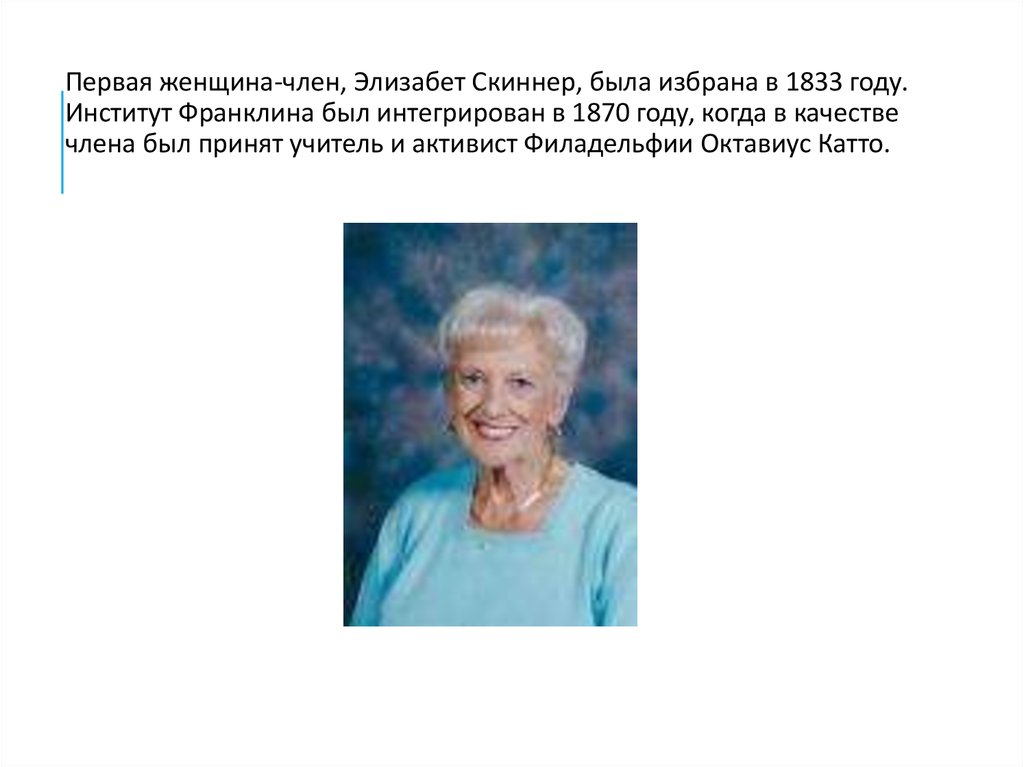 Первая женщина-член, Элизабет Скиннер, была избрана в 1833 году.Институт Франклина был интегрирован в 1870 году, когда в качестве