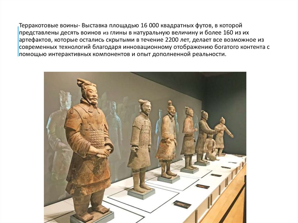 Терракотовые воины- Выставка площадью 16 000 квадратных футов, в которойпредставлены десять воинов из глины в натуральную величину и более 160 из их