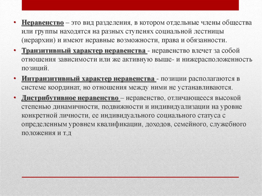 • Неравенство – это вид разделения, в котором отдельные члены обществаили группы находятся на разных ступенях социальной лестницы