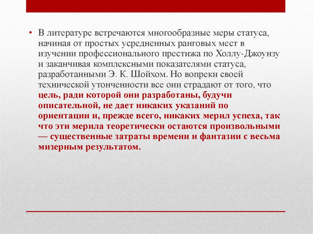• В литературе встречаются многообразные меры статуса,начиная от простых усредненных ранговых мест в