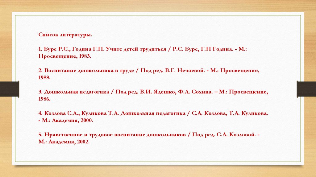Список литературы.1. Буре Р.С., Година Г.Н. Учите детей трудиться / Р.С. Буре, Г.Н Година. - М.: