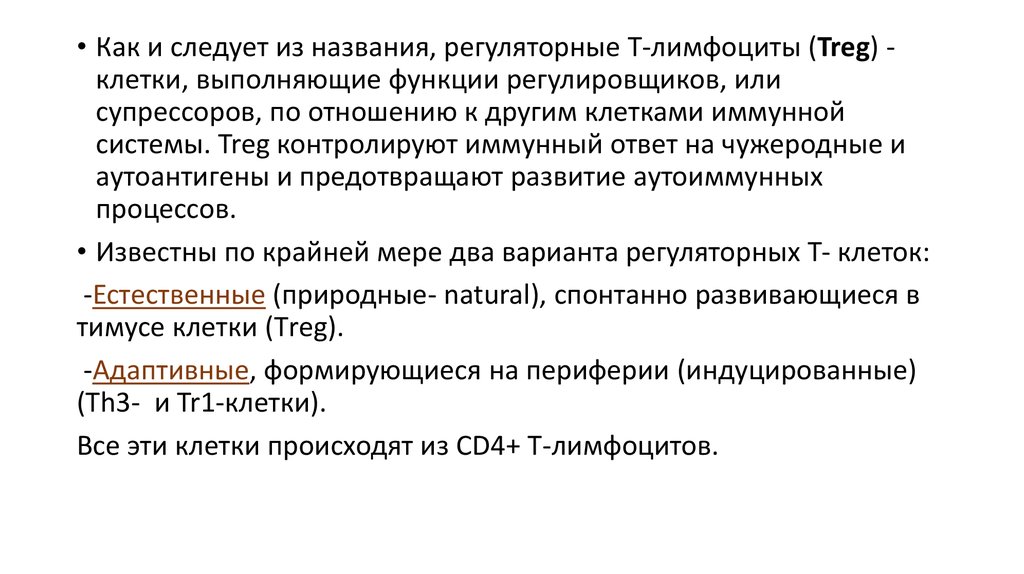 • Как и следует из названия, регуляторные Т-лимфоциты (Treg) клетки, выполняющие функции регулировщиков, илисупрессоров, по отношению к другим клетками иммунной