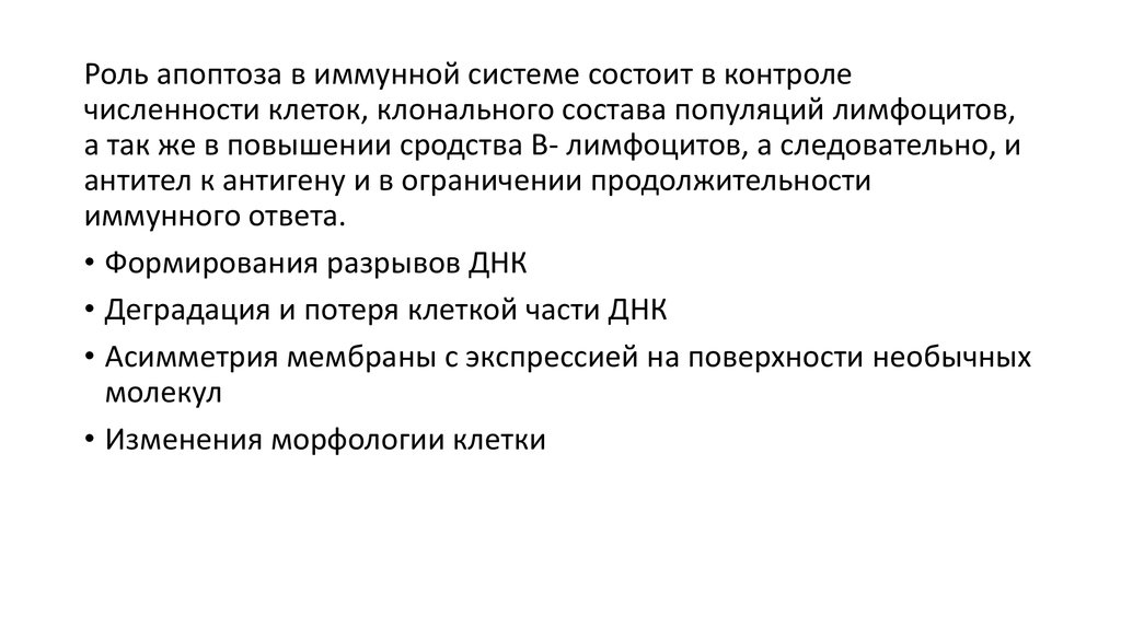 Роль апоптоза в иммунной системе состоит в контролечисленности клеток, клонального состава популяций лимфоцитов,