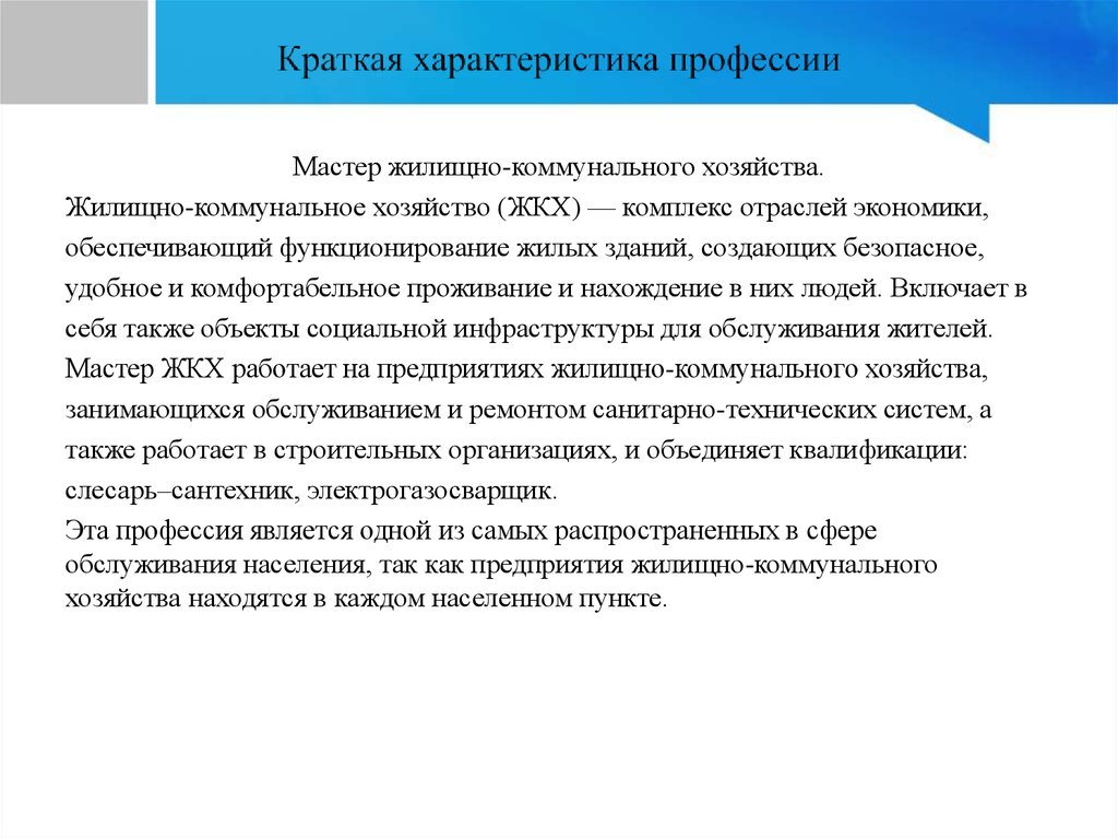 Мастер жилищно-коммунального хозяйства.Жилищно-коммунальное хозяйство (ЖКХ) — комплекс отраслей экономики,