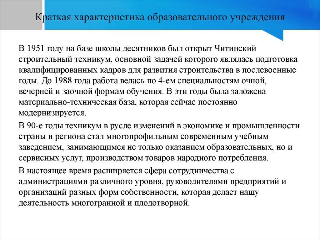В 1951 году на базе школы десятников был открыт Читинскийстроительный техникум, основной задачей которого являлась подготовка