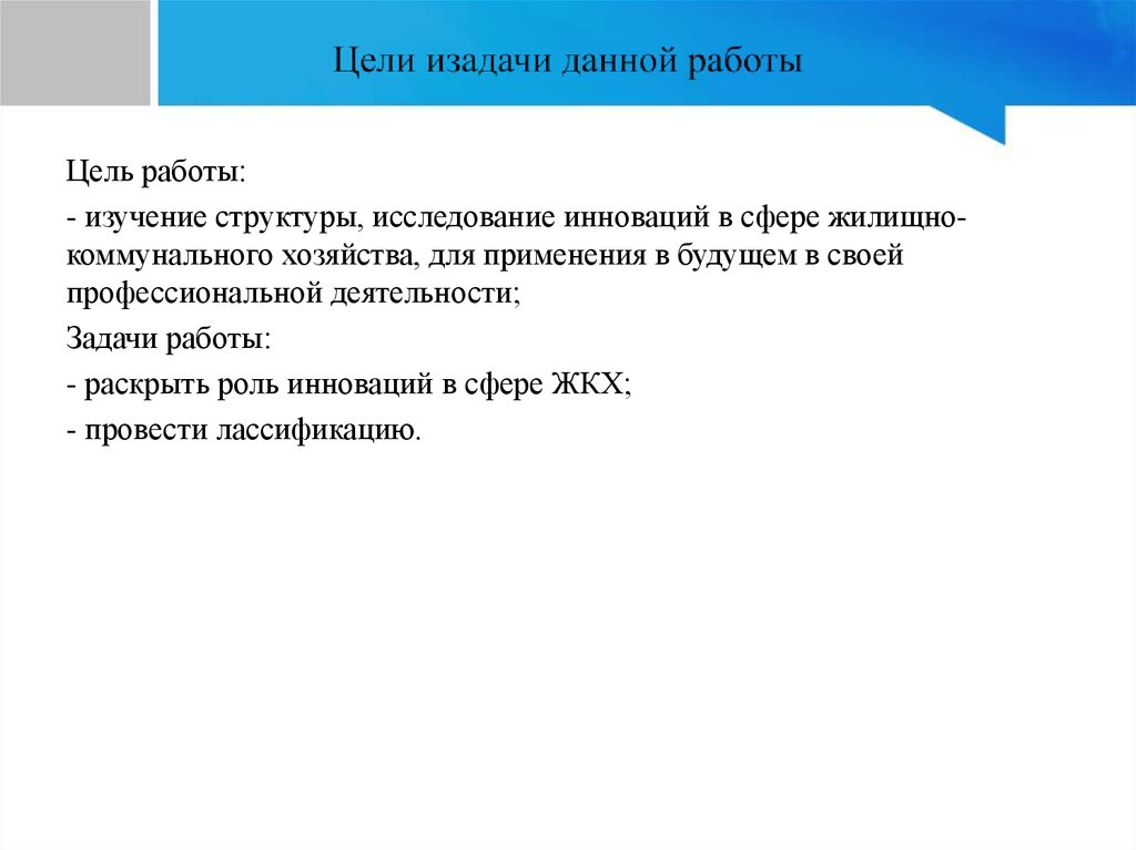 Цель работы:- изучение структуры, исследование инноваций в сфере жилищнокоммунального хозяйства, для применения в будущем в своей