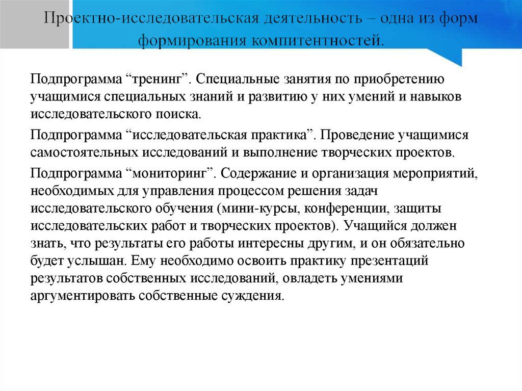 Подпрограмма “исследовательская практика”. Проведение учащимися