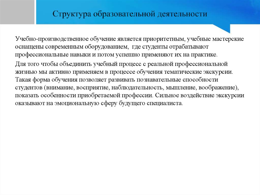 Учебно-производственное обучение является приоритетным, учебные мастерскиеоснащены современным оборудованием, где студенты отрабатывают