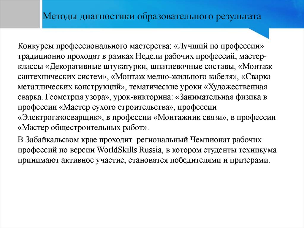 Конкурсы профессионального мастерства: «Лучший по профессии»традиционно проходят в рамках Недели рабочих профессий, мастерклассы «Декоративные штукатурки, шпатлевочные составы, «Монтаж