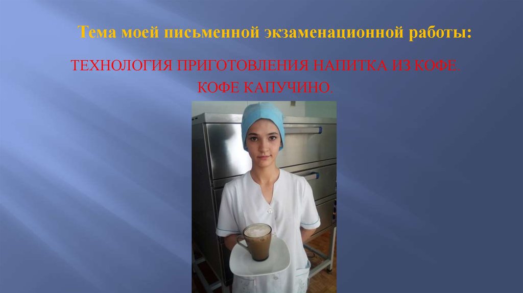Тема моей письменной экзаменационной работы:ТЕХНОЛОГИЯ ПРИГОТОВЛЕНИЯ НАПИТКА ИЗ КОФЕ.