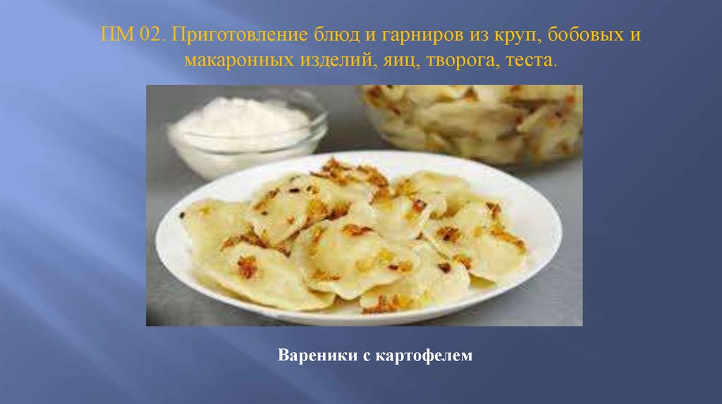 ПМ 02. Приготовление блюд и гарниров из круп, бобовых имакаронных изделий, яиц, творога, теста.