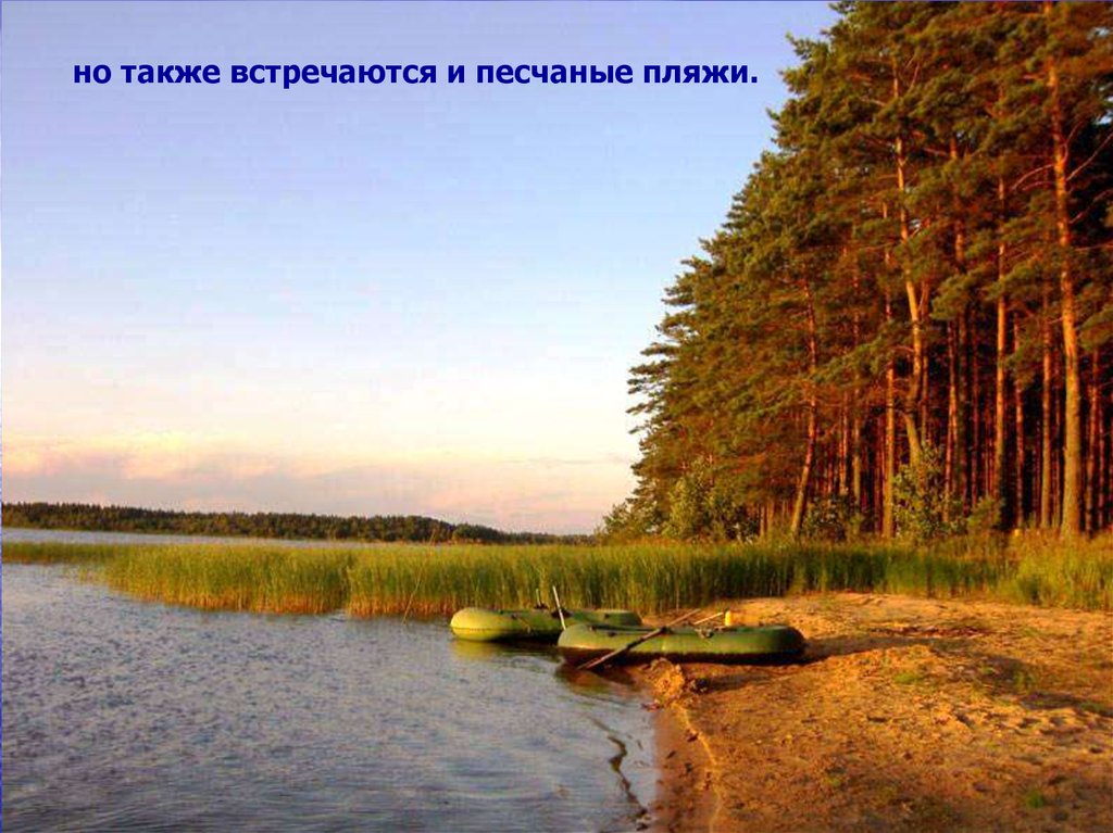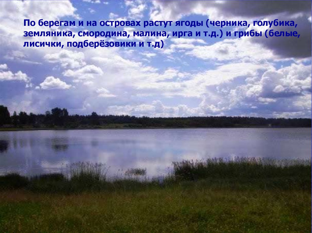 По берегам и на островах растут ягоды (черника, голубика,земляника, смородина, малина, ирга и т.д.) и грибы (белые,