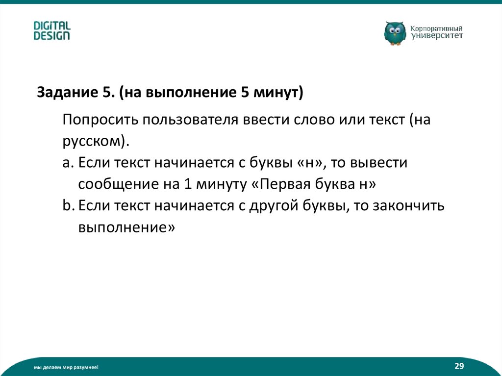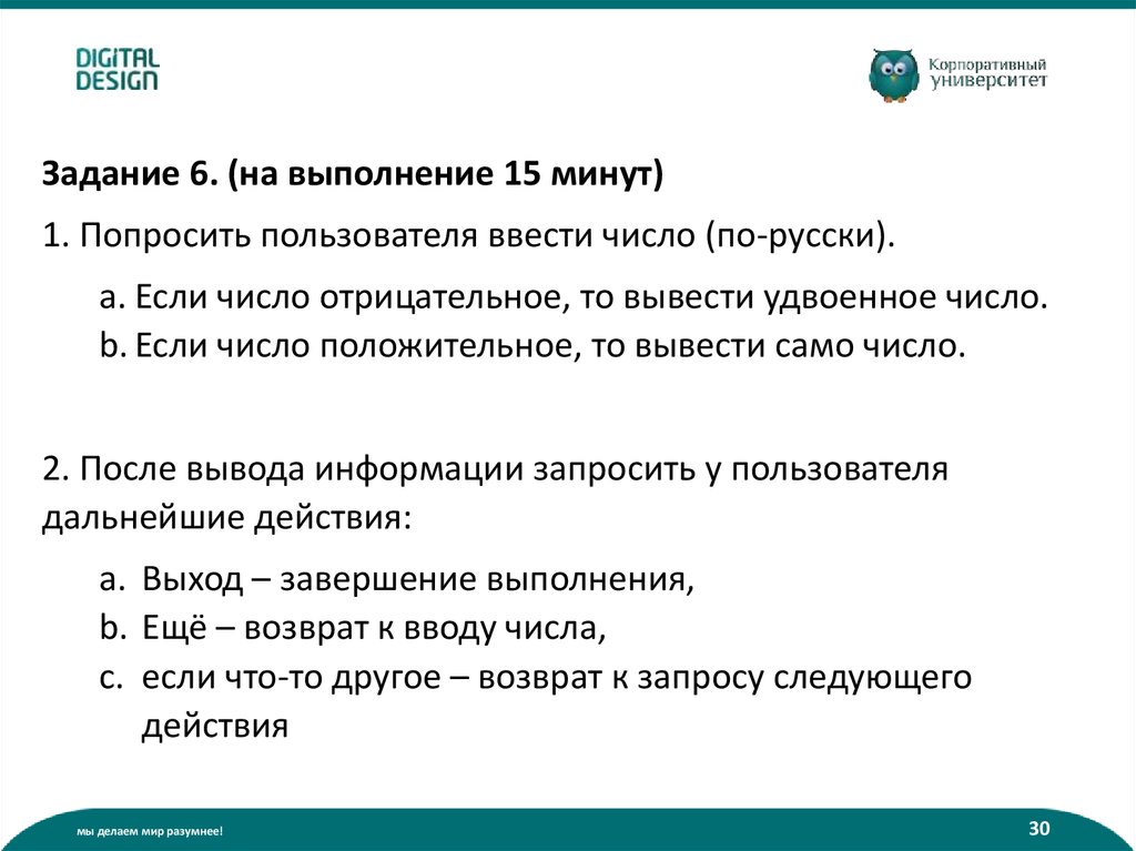 Задание 6. (на выполнение 15 минут)1. Попросить пользователя ввести число (по-русски).
