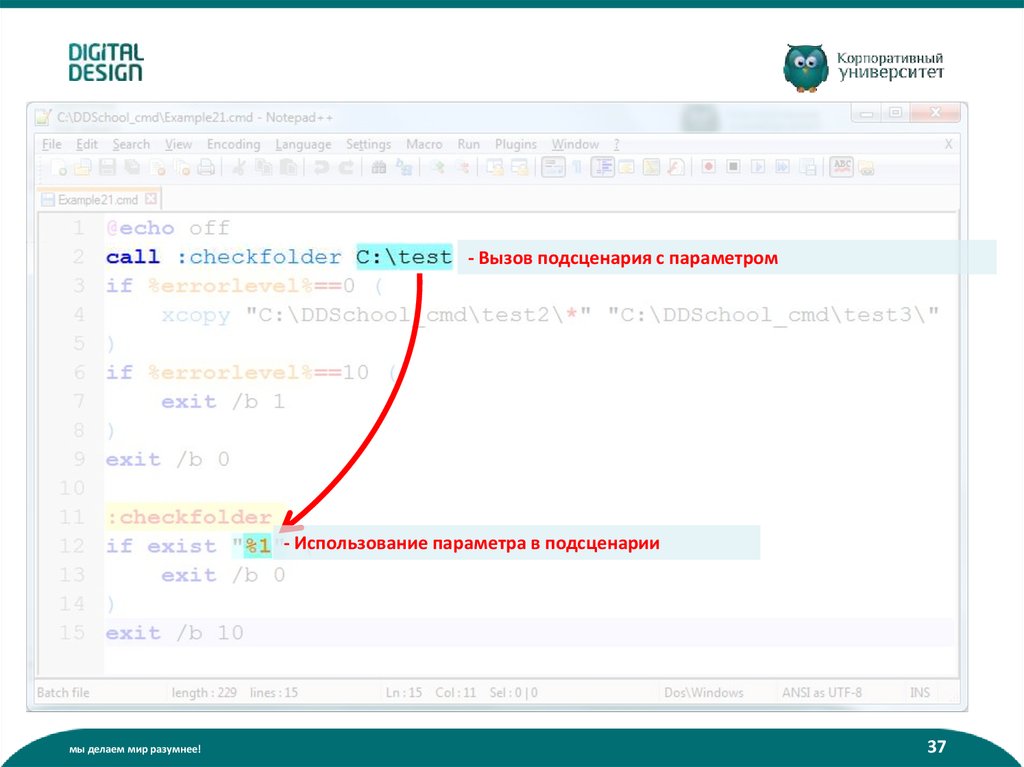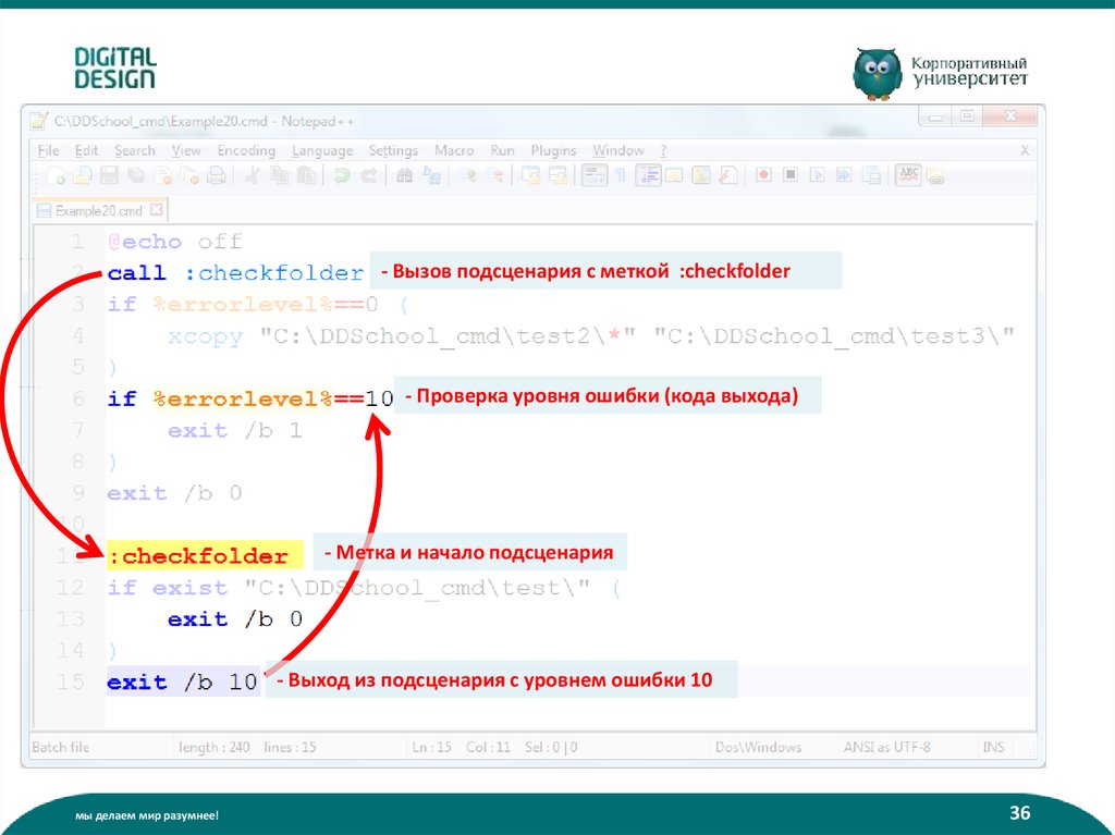 - Вызов подсценария с меткой :checkfolder- Проверка уровня ошибки (кода выхода)