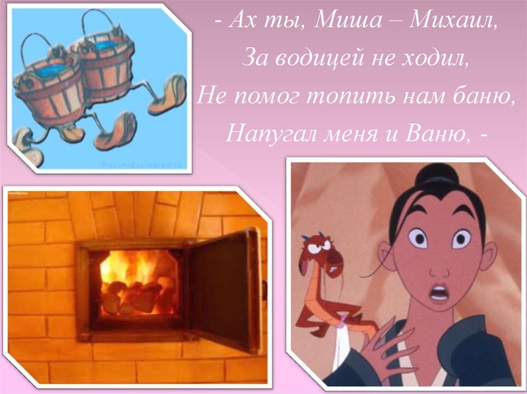 - Ах ты, Миша – Михаил,За водицей не ходил,