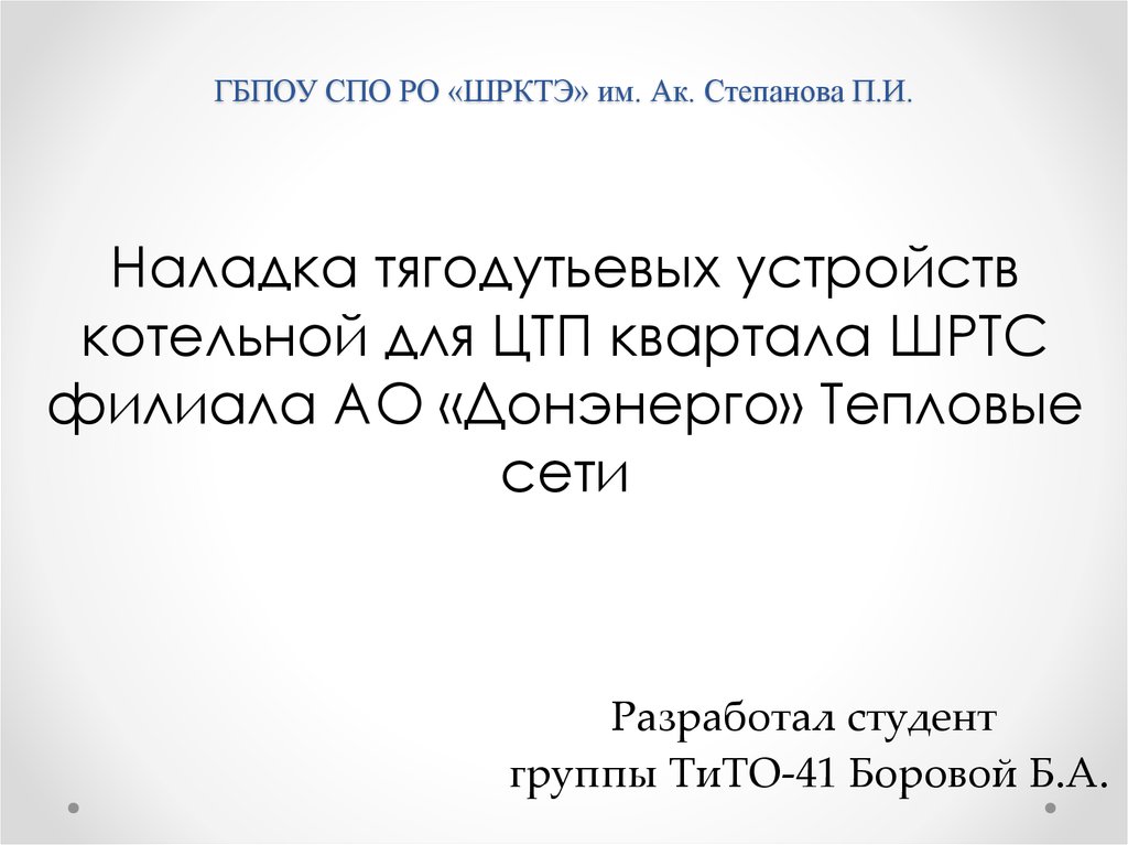 Наладка тягодутьевых устройств котельной для ЦТП квартала ШРТС филиала АО «Донэнерго» Тепловые сети