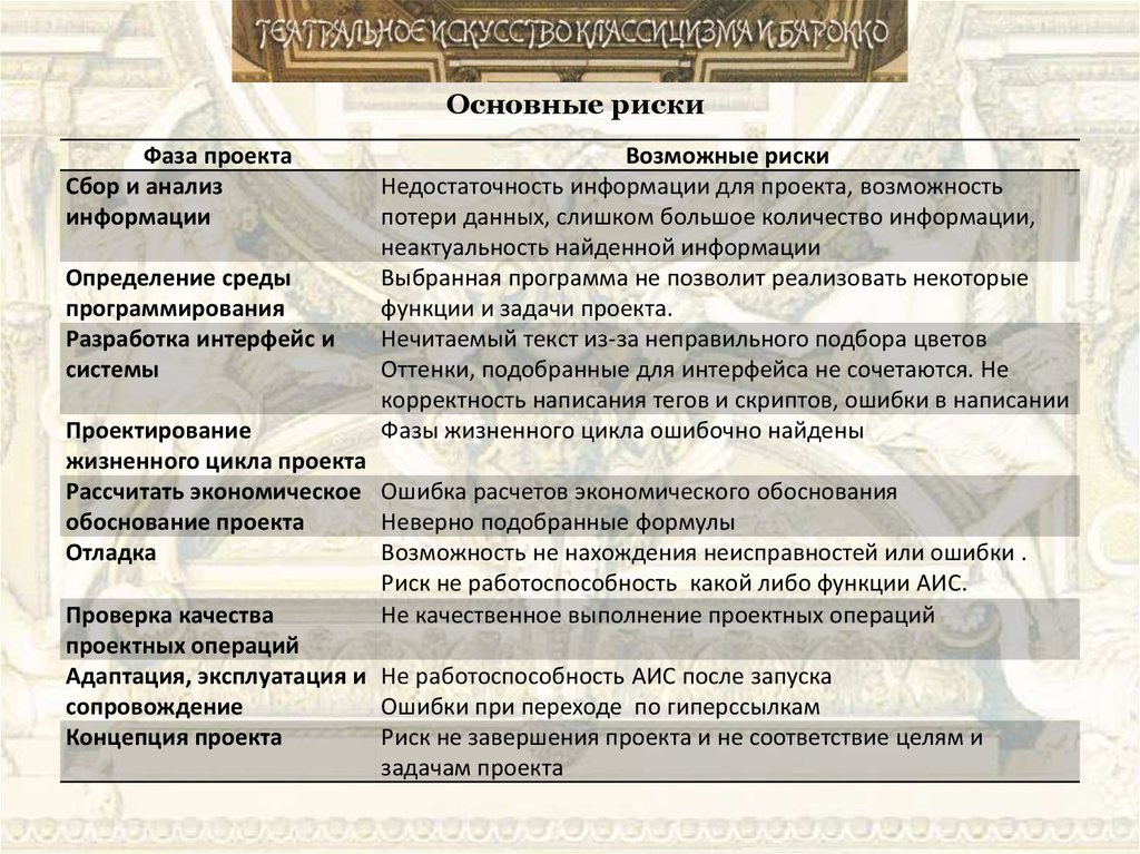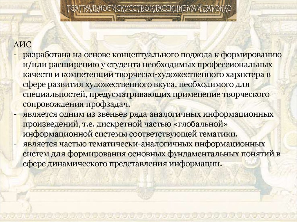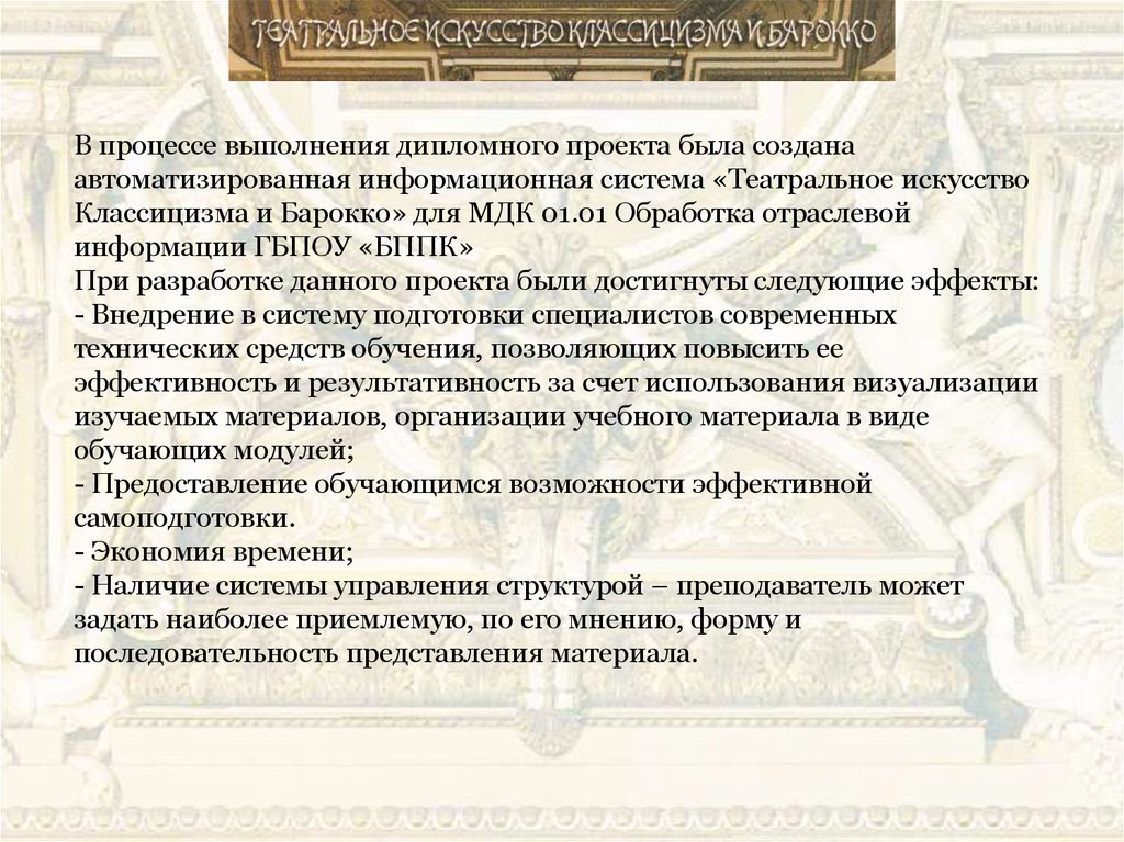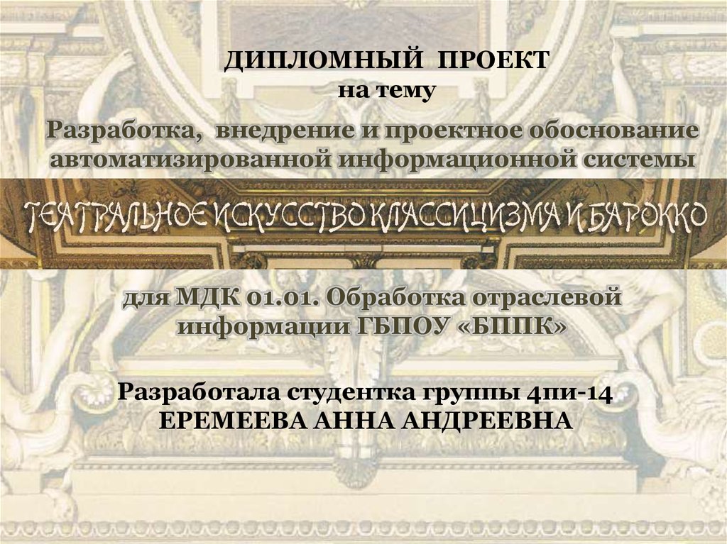 Классицизма и Барокко» для МДК 01.01 Обработка отраслевой